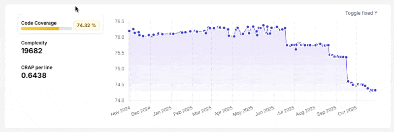 Today we are adding graphs for CRAP per line and Complexity when viewing the repository, for all plans. Simply click the metrics when available and it will show you a history of coverage, complexity or 'CRAP per line' respectively.